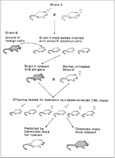FIG.1: Experimento sobre la herencia de inmunidad adquirida. De “Lamarck´s Signature”, Steele 1998