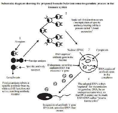 Figure 5. Schematic diagram showing the proposed ‘Somatic Selection’ soma-to germline process in the in the immune system proposed by Steele (1979) and modified from Steele et al. (1998), and to which we adhere for late metazoans with epigenetic development that possess a clearly differentiated germline. Such organisms developed a germline alter the primordia of major organ systems of the adult had become established (e.g. annelids). Our adherence to this Neo Lamarckian theory extends to the other extreme of the embryological iming that specifically includes the terminal differentiation of the germline, in organisms with preformistic development (e.g., mammals, bird, mice, and humans). Here the germline is terminally differentiated in earliest ontogeny, in which orientation of maternal-derived determinants deposited in the egg in present. 1. A diverse array of B lymphocytes exists before the entrance of a foreign antigen into the system. Each cell exposes on its surface membrane antibodies of one unique specificity. The variable (V)-region genes of the lymphocytes encode those parts of the antibody that form the antigen-combining site. A foreign antigen binds to those b cell which have compatible antibodies; therefore, these cells are ‘selected’ in a Darwinian manner, generally called clonal selection. 2. After antigen binding the B cell is activated and divides, producing progeny profusely that in turn divide, producing more identical progeny cells. A clone of identical cell expressing that antibody is produced (this is called clonal expansion). Individual cell of the clone can mutate their variable region genes (see Figures 2 and 6) that can themselves be selected by an antigen to produce another clone. 3. Within cell of the clone, RNA copies of antibody V genes are made in the nucleus. Mature mRNA is sent to the cytoplasm where it is translated into the appropriate sequence of amino acids making up the protein chains of the antibody. 4. RNA molecules encoding V genes (in the nucleus of the cytoplasm) may be engulfed by innocu-ous endogenous RNA retroviruses (produced by the cell) and complementary DNA copies of the RNA made by the viral enzyme, reverse transcriptase. These are the molecules that probably belong to the ancient RNA world and which were discovered by Temin in 1959 (see Temin, 1989) and by Temin and Baltimore in RNA tumor viruses in 1970. 5. According to Steele (1979) and to Steele et al. (1998) Neo-Lamarckian theory, which we adhere to for late Metazoan epigenetic organisms, and to the other extreme of the ontogenetic timing, for those with a preformistic mode of development, copies of the antibody V genes are transferred (alla Temin and Baltimore) by the virus with the inserted somatically mutated characteristic to sperm or egg nuclei. Thus, the germline DNA is enriched with more essential elements of the antibody repertoire. See a molecular unifying hypothesis (Bladen and Steele, 1998)
