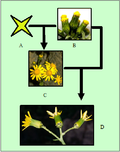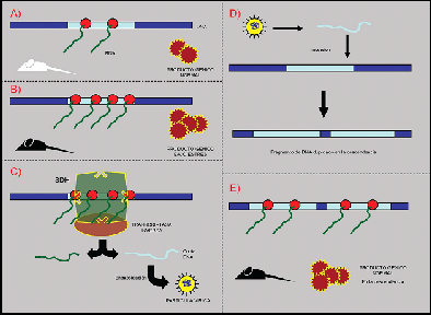 FIG. 3: Mecanismo propuesto para la transmisión de caracteres adquiridos. Izquierda: línea somática del parental. A) Producto normal del tipo parental. B) Producto en masa bajo estrés ambiental. C) Actividad del SDH-trascriptasa inversa, retrotrascripción y encapsidación de la copia del gen. Derecha superior: línea germinal del parental. D) Inserción de la copia produciendo una duplicación del gen. Derecha inferior: línea somática de la descendencia. E) Producto normal del tipo descendiente. (Daniel Heredia, 2005)