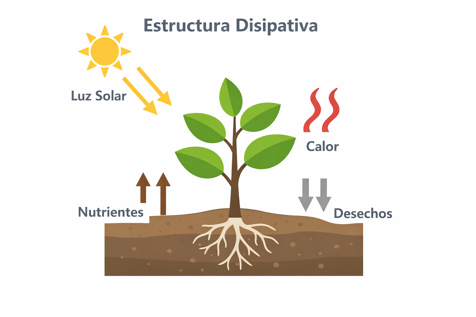 Las estructuras disipativas son estructuras coherentes y autoorganizadas como sistemas abiertos alejados del equilibrio, que requieren un intercambio de energía y/o materia con su entorno para autosostenerse. Presentan un alto grado de orden, lo que provoca su irreversibilidad.