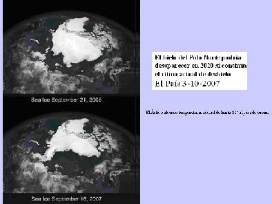 Los datos son estremecedores. El casquete helado del Ártico ha sufrido un deshielo que se ha acelerado mucho más de lo previsto en los últimos 20 años. Los expertos calculan que, a este ritmo, desaparecerá por completo dentro de doce años. Carece de importancia la exactitud de la predicción. Posiblemente el proceso sea más rápido, porque es un fenómeno que se retroalimenta (cuanto menos hielo, menos capacidad para reflejar el calor del Sol, con lo que el fenómeno se acelera), y además el calentamiento está influido por otros factores ya mencionados en nuestro manifiesto. Lo que es evidente es que el proceso ya está desencadenado y no se podrá parar.