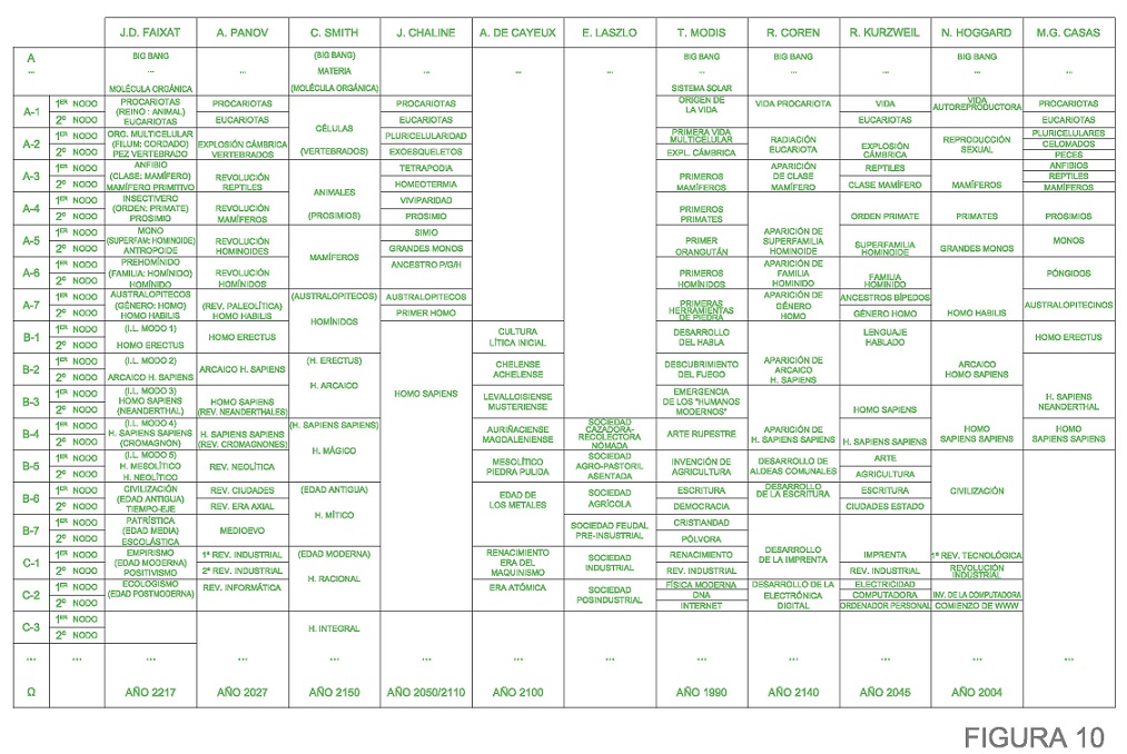 Ajustando nuestra “tabla periódica” de ritmos con las fechas de aparición de la materia —Big Bang— y de la vida orgánica, observamos que se van marcando, con gran precisión, todos los momentos de surgimiento de los sucesivos grados taxonómicos de la filogenia humana: ¡Reino: animal, Filum: cordado, Clase: mamífero, Orden: primate, Superfamilia: hominoide, Familia: homínido y Género: homo! Y, a continuación, sucede lo propio con todas las fases de maduración de nuestros primitivos ancestros: ¡h. hábilis, h. erectus, arcaico h. sapiens, h. sapiens y h. sapiens sapiens! Y, una vez más, se vuelve a repetir la precisión de nuestra hipótesis con las sucesivas transformaciones vividas por la humanidad en su historia más reciente: ¡Neolítico, Edad Antigua, Edad Media, Edad Moderna y la emergente Edad Posmoderna! Si, tal como vemos, todas estas etapas se ajustan de forma rotunda con las previsiones de la “tabla periódica” de ritmos que hemos planteado, resulta más que probable que nuestra hipótesis puede darnos también la clave para vislumbrar las sucesivas fases que se desplegarán, en los próximos años, en un proceso progresivamente acelerado que habrá de conducir, finalmente, hacia un instante de creatividad infinita —Omega— dentro de un par de siglos.