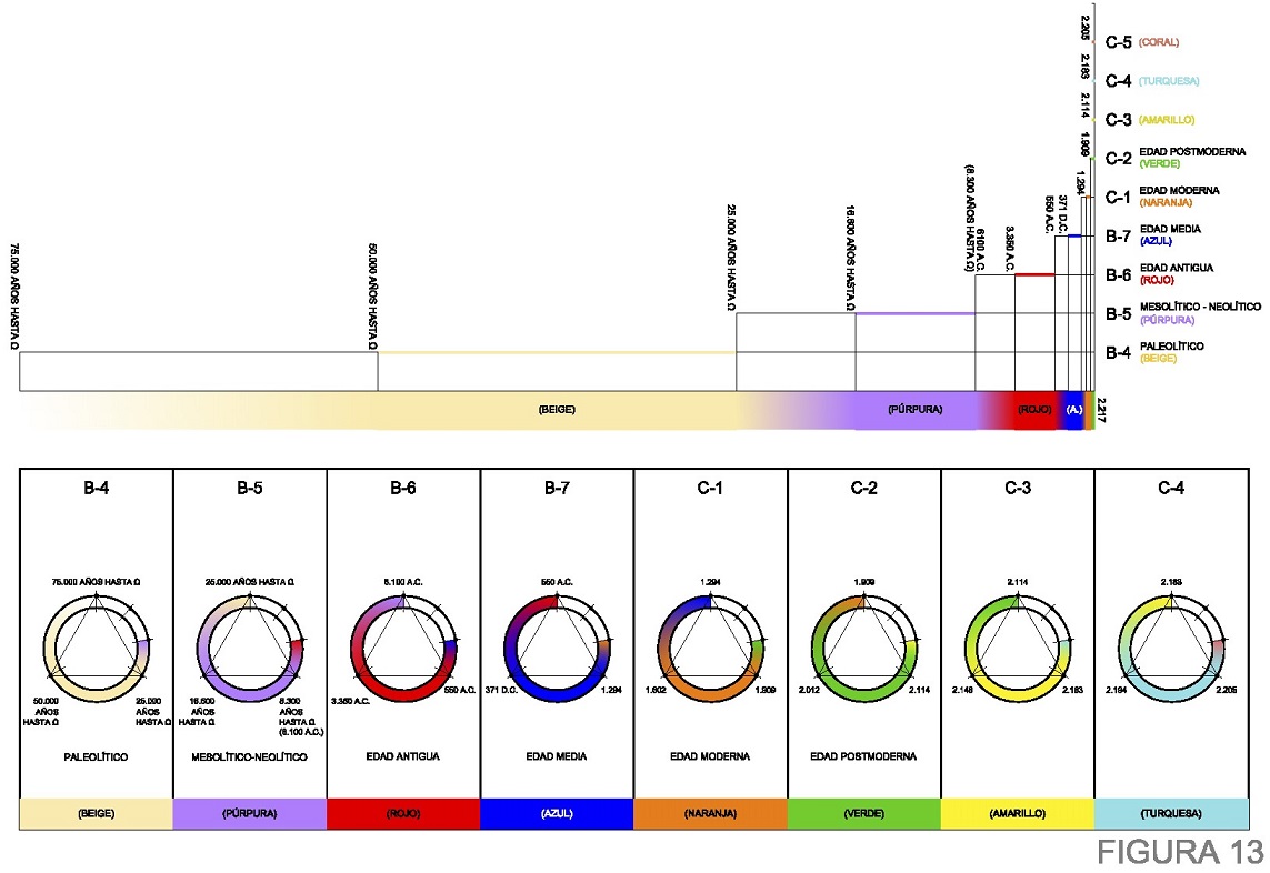 Te sugiero, querido lector, que estés preparado para nuevas sorpresas, porque resulta que ¡todas estas etapas que señala Laszlo —que coinciden con la clasificación tradicional de: Paleolítico superior, Neolítico, Edad Antigua, Edad Media, Edad Moderna y Edad Postmoderna (en la que estaríamos entrando realmente ahora)— se ajustan con absoluta precisión a todos los ciclos previstos en nuestra hipótesis de ritmos! Vamos a comprobarlo.