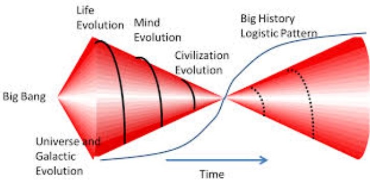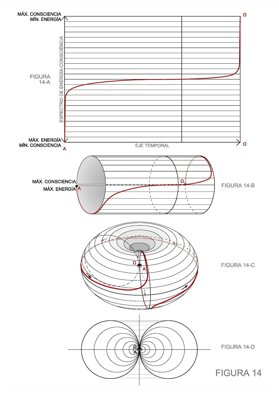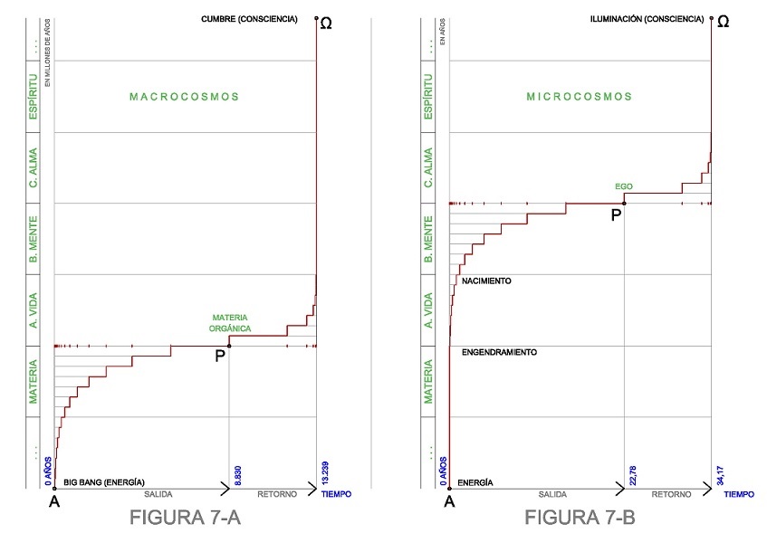 Emplazando, pues, el Big Bang como origen de la trayectoria evolutiva global, y el momento de formación de la Tierra como segundo nodo de esa trayectoria, denominaremos —recordad la fig. 2-C— proceso de “salida” al itinerario recorrido entre ambos puntos —desde la energía potencial del vacío originario hasta la formación de la materia compleja—, y proceso de “retorno” a todo el despliegue evolutivo de la vida acontecido desde entonces.