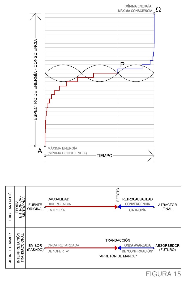 Resumiendo nuestra propuesta podemos decir que, al igual que cuando se emite una nota determinada en un instrumento musical, simultáneamente, suena una amplísima gama de sus armónicos, del mismo modo, el universo en su conjunto posee, desde el mismo instante de su vibración originaria, todo una jerarquía potencial de ondas estacionarias, por las que pueden ascender sus flujos creativos. Según nuestro esquema, partiendo de la vibración puntual del origen, el proceso universal comienza con una explosión vertiginosa de creatividad y saltos de nivel, que, paulatinamente, va desacelerando su ritmo en el camino de ascenso hacia un determinado estrato del espectro —el “sonido fundamental”—, para, a partir de ahí, comenzar a acelerar de nuevo, progresivamente, su ritmo de saltos novedosos, a lo largo del tramo de subida que se orienta hacia una imparable vibración puntual final de creatividad infinita. Más tarde analizaremos el sentido profundo de esos sorprendentes polos original y final, pues ahí encontraremos, precisamente, la clave a muchas de nuestras preguntas.
