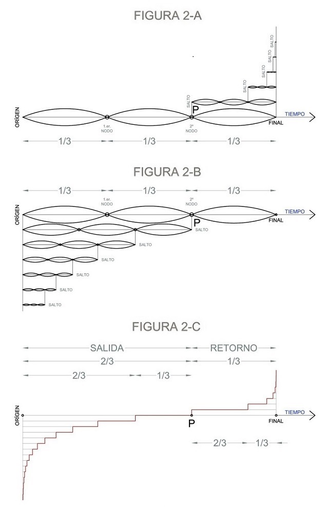 En las figs. 2 podemos observar gráficamente el proceso global. Tomando la trayectoria temporal completa —desde el “origen” hasta el “final”— como sonido fundamental, hemos dibujado los sucesivos saltos de nivel en ambos sentidos: en la fig. 2-B el tramo que va desde el origen hasta el segundo nodo “P” de exteriorización —lo que se denomina el tramo de “salida” o “hacia fuera”—, y en la fig. 2-A el trecho que abarca desde ese mismo segundo nodo hasta el final —el tramo de “retorno” o “hacia dentro”. En la fig. 2-C reflejamos la trayectoria conjunta, la escalera global de la evolución.