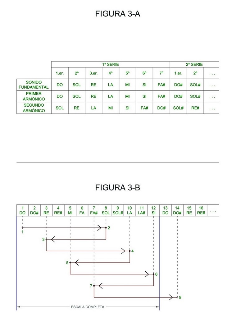 Decíamos hace un momento que si nuestra cuerda de guitarra está afinada en la nota do, su segundo armónico —1/3 de su longitud— será un sol. A su vez, el segundo armónico de este sol, será un re. Y el de este re, será un la. Y si repetimos la operación indefinidamente, obtendremos una cadena de sonidos —do, sol, re, la, mi, si#, do#, sol#...— que sigue exactamente el orden de las “tonalidades de sostenidos”. Si consideramos que cada nota de esta cadena constituye el sonido característico de un “ciclo” determinado, con cada tercio de la duración obtendremos un sonido nuevo y, por tanto, un “salto de ciclo”. En la fig. 3-A quedan reflejados los sucesivos sonidos fundamentales con sus correspondientes armónicos, y en la fig. 3-B se indica, precisamente, el orden en que van surgiendo esos sonidos, sin tener en cuenta la escala en la que aparecen. Como podemos ver, tras cada siete ciclos se vuelve a repetir la misma serie de notas en un semitono más alto. Denominaremos, pues, simplemente “serie” a cada uno de los sucesivos grupos de siete ciclos que vayan surgiendo, y “salto de serie” a las transiciones entre ellos.