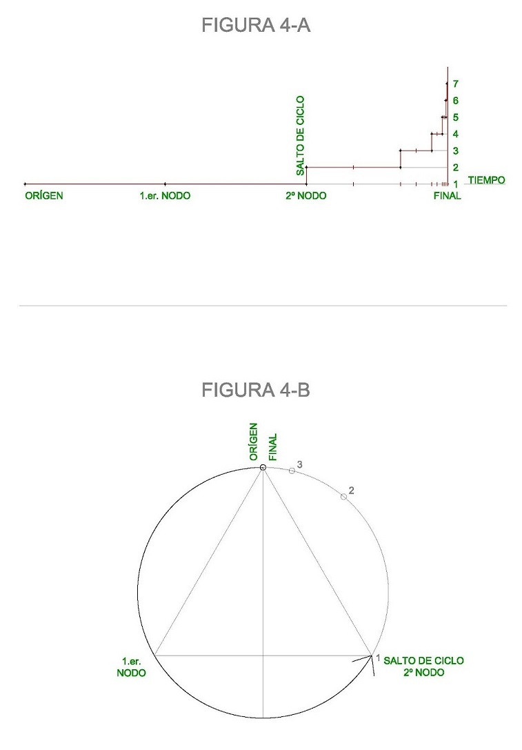 Antes de empezar, queremos aclarar que los gráficos que vamos a utilizar serán de dos tipos: unos rectilíneos —fig. 4-A—, en los que se verá la escalera evolutiva correspondiente a cada serie, y otros circulares —fig. 4-B—, en los que se detallará cada ciclo independientemente y que nos permitirán observar las múltiples correspondencias entre ellos. Pero no olvidemos que son, simplemente, dos formas diferentes de expresar los mismos datos.