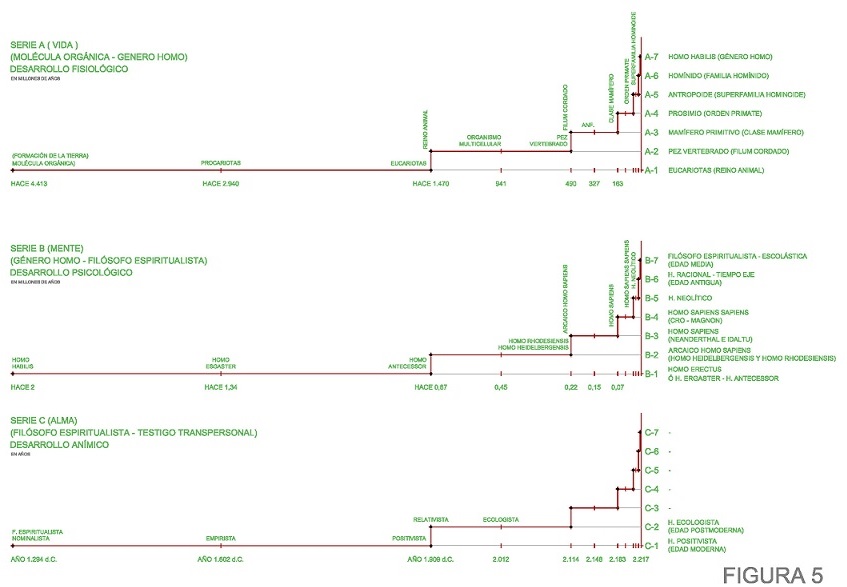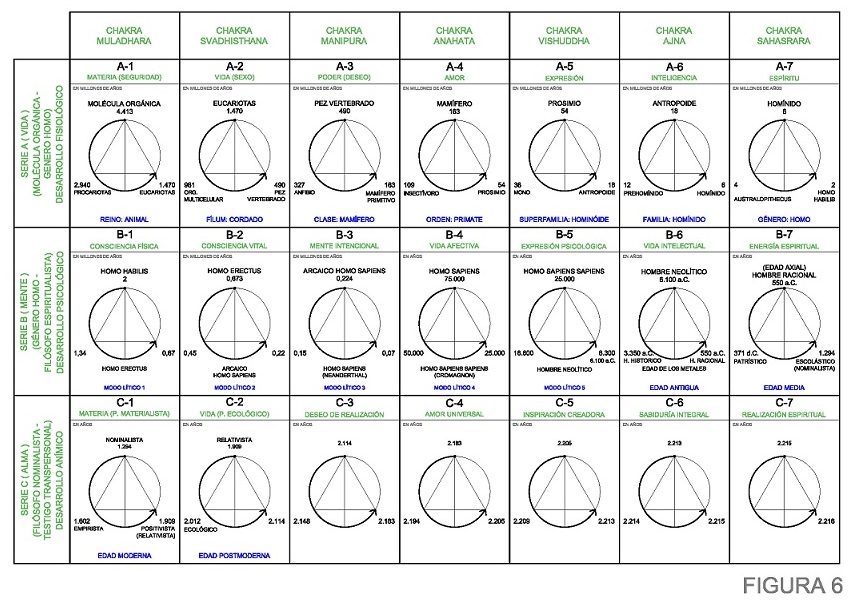 Vamos a pormenorizar, a continuación, precisamente, ese tramo de “retorno”. Pero, antes, quisiéramos recordar que uno de los problemas fundamentales de la teoría evolutiva clásica, consiste en explicar la aparición de las acentuadas discontinuidades que se observan entre los principales grupos taxonómicos, y, sin embargo, por el contrario, ¡nuestro esquema de ritmos va marcando, con absoluta precisión, justamente los momentos de surgimiento de los sucesivos grados taxonómicos del proceso filogenético del ser humano! ¡Reino: animal, en el primer ciclo, Filum: cordado, en el segundo ciclo, Clase: mamífero, en el tercer ciclo, Orden: primate, en el cuarto ciclo, (Superfamilia: hominoide, en el quinto ciclo), Familia: homínido, en el sexto ciclo, y Género: homo, en el séptimo ciclo! Veámoslo, detenidamente, paso a paso. Os recomiendo ir mirando las figuras 5 y 6 al tiempo que vais leyendo el texto.