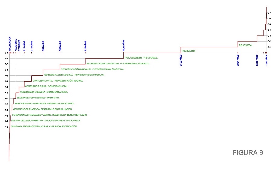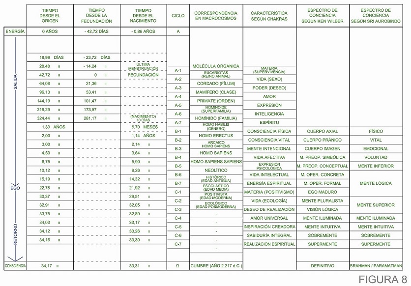 Todo esto es, en verdad, inesperado y sorprendente, pero resulta ya prácticamente definitivo cuando comprobamos que la misma hipótesis que se ha comportado con gran precisión al aplicarla al proceso de la evolución global, ¡hace lo propio al cotejarla con el proceso de desarrollo del ser humano individual!: en la misma trama temporal, con idéntica pauta de despliegue y repliegue, y atravesando las mismas etapas, nuestra “tabla periódica” de ritmos va marcando, puntualmente, paso a paso, las sucesivas fases de las que nos hablan los embriólogos, los psicólogos del desarrollo y los maestros espirituales, confirmando, así, la vieja idea del paralelismo filogenético-ontogenético, y apuntando, de forma muy concreta, hacia un sorprendente universo fractal y holográfico.