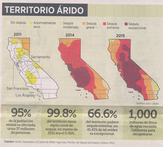 La sequedad es tal que, desde que inició el año hidrológico, en octubre, sólo se han captado 32 centímetros de lluvia, y en otras ciudades, como Sacramento, los últimos 15 meses se han reportado temperaturas hasta 6 grados más altas que lo normal.